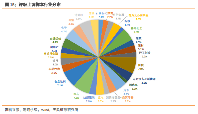 评级上调样本的行业分布如下图所示,样本在各行业中的分布较为均匀,接近90%的行业都有2%以上的占比,未出现样本集中于部分行业的情形。