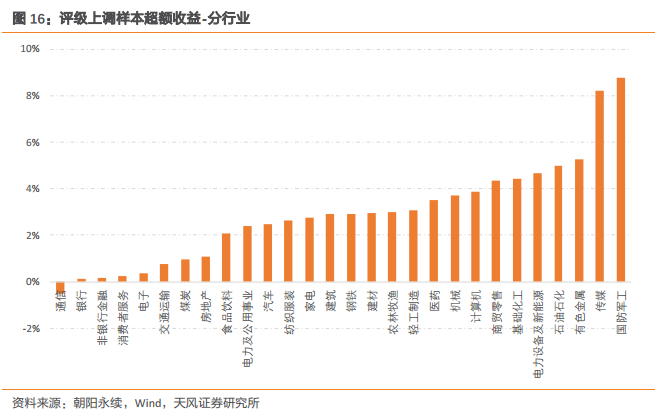 首先,我们按中信一级行业分类分别计算各行业样本相对行业指数的平均超额收益。如下图所示,来自国防军工、传媒、有色、石油石化、、电力设备及新能源等行业的评级上调样本能获得相对行业指数更高的收益;而来自通信、银行、非银金融、消费者服务、电子等行业的评级上调样本的超额收益则相对较低。总体而言,区分度越大的行业分析师推荐有效性越高。
