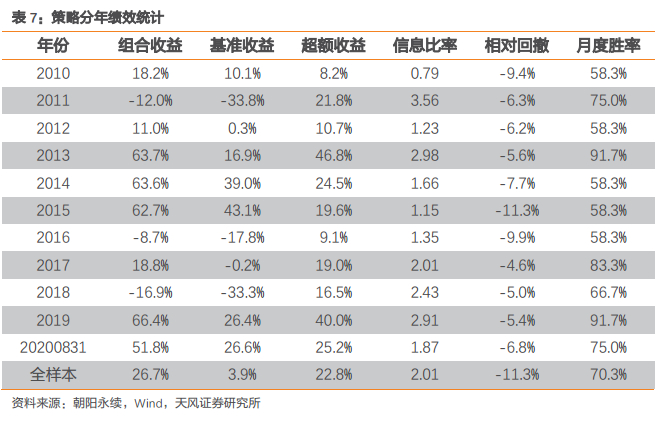 策略2010年以来的分年绩效统计如下表所示,策略每年相对中证500指数都能取得接近或超过10%的超额收益,除2015年外的其余年份相对中证500指数最大回撤均能控制在10%以内。
