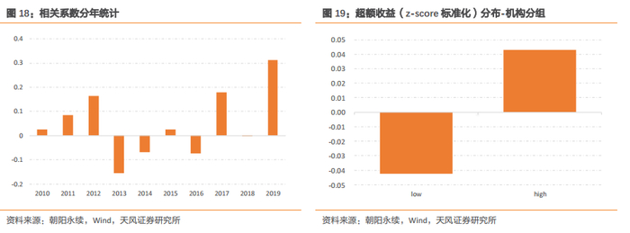我们发现机构的这种“推票”能力表现一定持续性,但是相关性并不明显和稳定。我们逐年计算每家机构推荐的平均超额收益与下年平均超额收益之间的相关系数,结果如下左图所示,2010年以来该相关系数均值约为0.05。