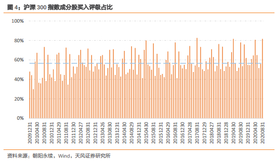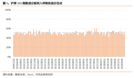 以沪深300指数为例,在其300只成分股中每月被分析师给出买入评级的数量占比均值超过50%,当一半的股票都被给出“买入”建议时,我们难以从这么大的样本空间中分辨出分析师对于这些股票的推荐力度差异。