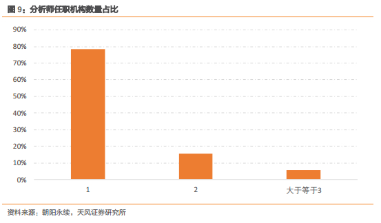 以往研究一般以“机构”作为“分析师”代理变量,通过匹配机构来获取分析师两次推荐之间对于盈利预测的调整。但是该方式弊端在于分析师跳槽时后的匹配的预测数据可能并非出自同一分析师,如下图所示任职机构数量大于1家的分析师占比超过20%,数量相当可观。