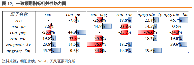 我们分别计算REC因子与常见的一致预期指标con_pe(一致预期市盈率),con_pe(一致预期市盈率),con_peg(一致预期PEG),con_roe(一致预期ROE),npcgrate_2y(一致预期净利润两年复合增长率),npgrate_3m(过去3个月一致预期净利润变化率)的相关性,因子间相关性热力图如下所示,rec因子与npgrate指标呈现出较高相关性外与其他指标之间具有较高独立性。