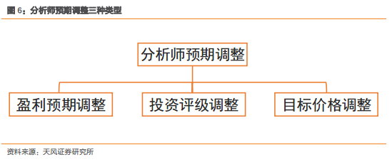 分析师预期调整与分析师推荐信息相一致共包含三种类型,分别是分析师调整股票的盈利预期、投资评级以及目标价格。如果分析师更新预期,提升股票的盈利预测、投资评级或者目标价格,这意味着分析师对于股票的表达出强烈看好的态度。