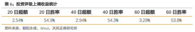 如下表所示,在投资评级上调事件触发后20日样本相对市场等权的平均超额收益为2.54%,胜率为54.9%;事件所带来的超额收益能持续1个季度,未来40日和60日的平均收益为2.94%和3.28%,胜率分别达到54.3%和53.8%。