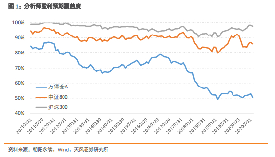 首先,分析师对于A股市场的全体股票具有较高覆盖度。我们筛选个股报告以及可信度大于等于5的报告预测数据,如果在最近6个月内有分析师对股票给出盈利预测则认为该股票被覆盖。从2011年以来分析师盈利预测在万得全A,中证800指数以及沪深300指数成分股的覆盖率如上图所示。