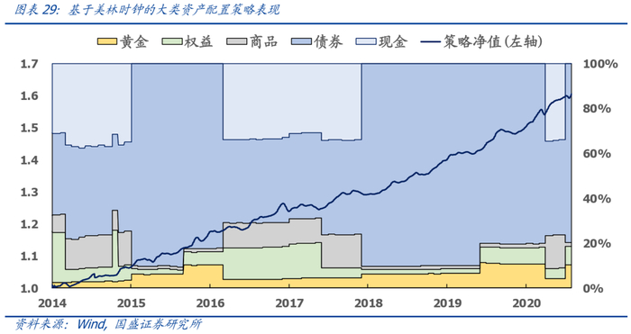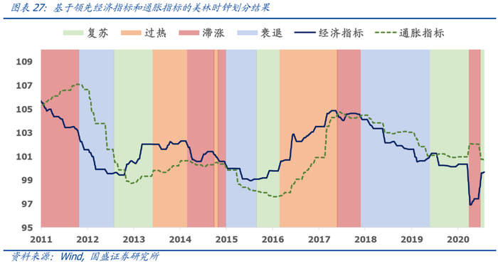 我们将经济指标设定为领先经济指标,将通胀指标设定为CPI和PPI的等权,并通过长短均线的相对位置判断当前趋势,改进了国内的美林时钟。从图表27的结果来看,由于经济指标的领先性,2011年以来我们构建的美林时钟具有较强的稳定性和匹配度,这一点对资产配置而言尤其重要。