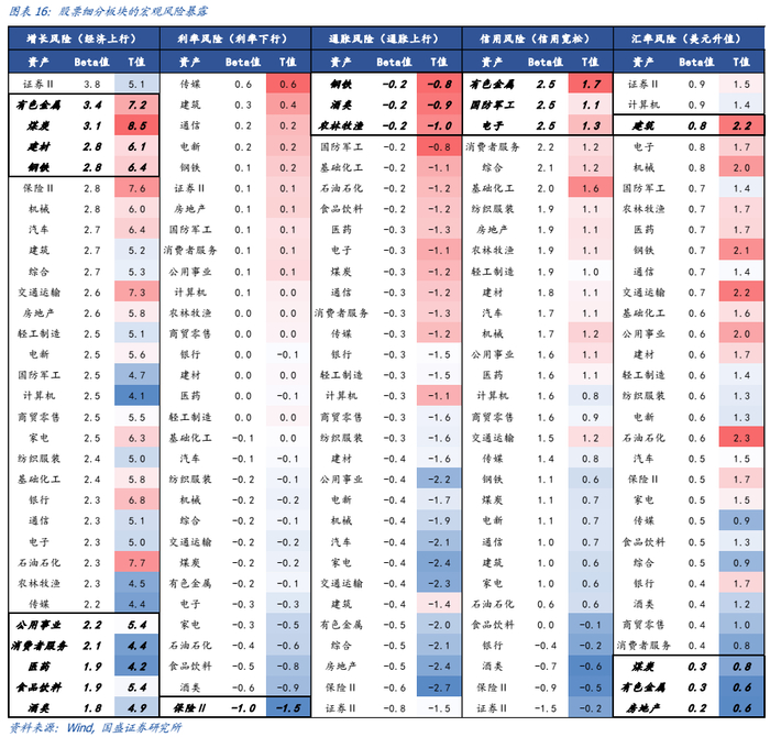 我们以高频宏观隐含因子作为自变量,以资产的日收益率作为因变量进行多元回归,并以Block-Boostrap的方式进行随机区间抽样,以1000次的随机抽样回归的平均作为最终结果,以此保证回归结果的稳健性。下面我们以大类资产和股票细分行业的宏观风险暴露为例进行展示。