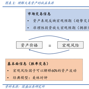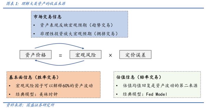类比于个股定价的经典公式:P = EPS * PE,我们认为大类资产的定价同样由两部分构成:资产价格 = 宏观风险 * 定价误差,也因此派生出四种交易理念和投资范式:
