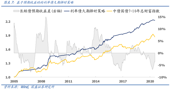 在专题报告《大类资产定价系列之二:利率债收益预测框架》中,我们曾介绍利率债的收益分解模型,将利率债收益分解为三个部分:远期利率、久期影响和凸性偏差三项。预期收益率是利率债较好的赔率指标,基于预期收益的久期择时策略能够实现5.5%的年化收益,最大回撤仅为2.8%,夏普比率为2.31。