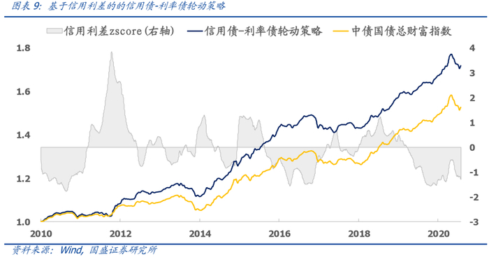 经研究,信用利差是信用债相对于利率债赔率的良好代理变量。从图表9和图表10的结果来看,基于信用利差的信用债-利率债轮动策略的年化收益为5.4%,最大回撤为5.6%,夏普比率为2.69,而中债国债总财富是指年化收益为4.2%,最大回撤为6.3%,夏普比率为1.94,无论收益还是回撤控制能力均有了明显提升。