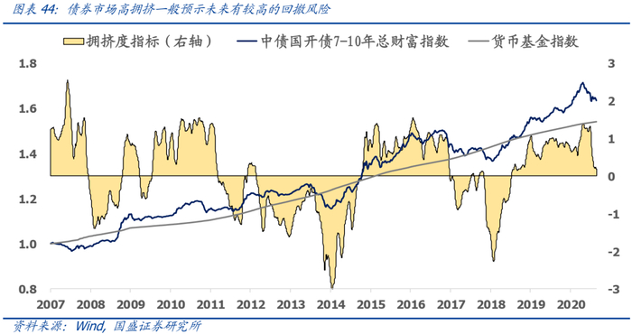 对于债券市场而言,我们以10年期国开债到期收益率-10年国债到期收益率作为债券市场的拥挤度指标。国开-国债利差可以作为债券市场拥挤度指标的逻辑是:10年期国开债久期较长、交易量大,因此常被交易盘(广义基金)用于进行波段交易,因此如果交易盘因为投机需求大量做多国开债,则会大幅压缩国开-国债利差,因此我们以国开-国债利差作为衡量债券市场交易拥挤度的核心指标。
