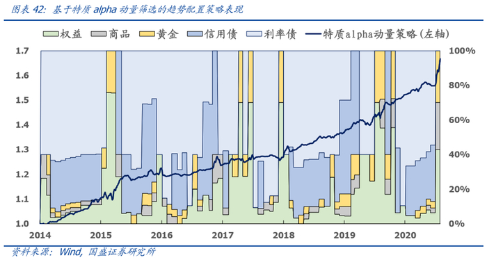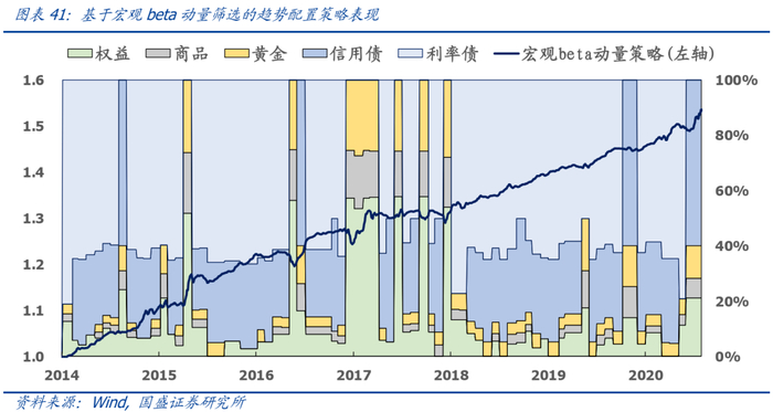 将大类资产的时序动量分解为宏观beta动量和特质alpha动量后,我们按照时序动量策略的配置流程,以宏观beta动量和特质alpha动量两个新的动量筛选指标进行资产筛选,将筛选剩下的资产按照风险平价进行加权。图表41-图表42为宏观beta动量策略和特质alpha动量策略的历史表现,两个策略的特点为: