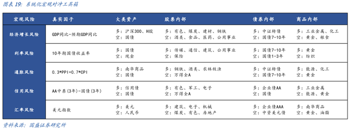 在图表19中,我们将上述多类资产的宏观风险映射结果整理成系统化宏观对冲的工具箱,该工具箱的作用有二: