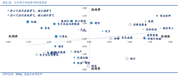 既然大类资产层面可以通过趋势和拥挤度的配合来提升策略收益,那么同样的方法能否用到风格择时和行业轮动里面呢?早在专题报告《因子择时的三个标尺:因子动量、因子离散度与因子拥挤度》和《行业轮动的三个标尺——因子投资2020(四)》中,我们便已详细介绍过风格轮动和行业轮动的趋势-拥挤度分析框架。