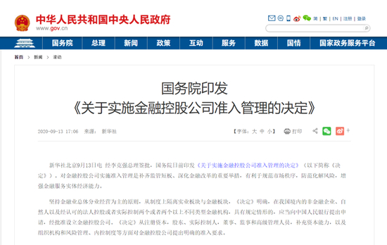 9月13日,国务院发布《关于实施金融控股公司准入管理的决定》(以下简称《准入决定》),授权央行对金融控股公司开展市场准入管理并组织实施监管。同日,央行正式对外发布《金融控股公司监督管理试行办法》(下称《金控办法》),并自2020年11月1日起施行。