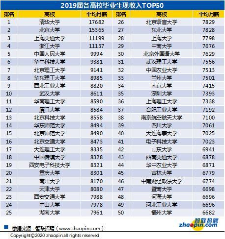 具体来看,清华大学以17682元/月名列榜首,北京大学(15365元/月)、上海交通大学(11199元/月)、浙江大学(11137元/月)位列其后,毕业生现平均月薪均超过万元。