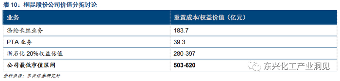 根据重置成本法我们计算可得桐昆股份现有的涤纶长丝和PTA资产价值分别为183.7和39.3亿元。同时我们通过不同方法讨论了浙石化项目的权益价值,按照PE相对估值法、炼油能力和FCFF三种方法对浙石化项目给出的最低估值分别为1567亿元、1400亿元和1984亿元,对应公司持有20%权益价值分别为313亿元、280亿元和397亿元。综合来看,在不考虑行业景气恢复带来的价值提升、浙石化炼化竞争优势的前提下,公司的合理估值应当在503亿元-620亿元之间。