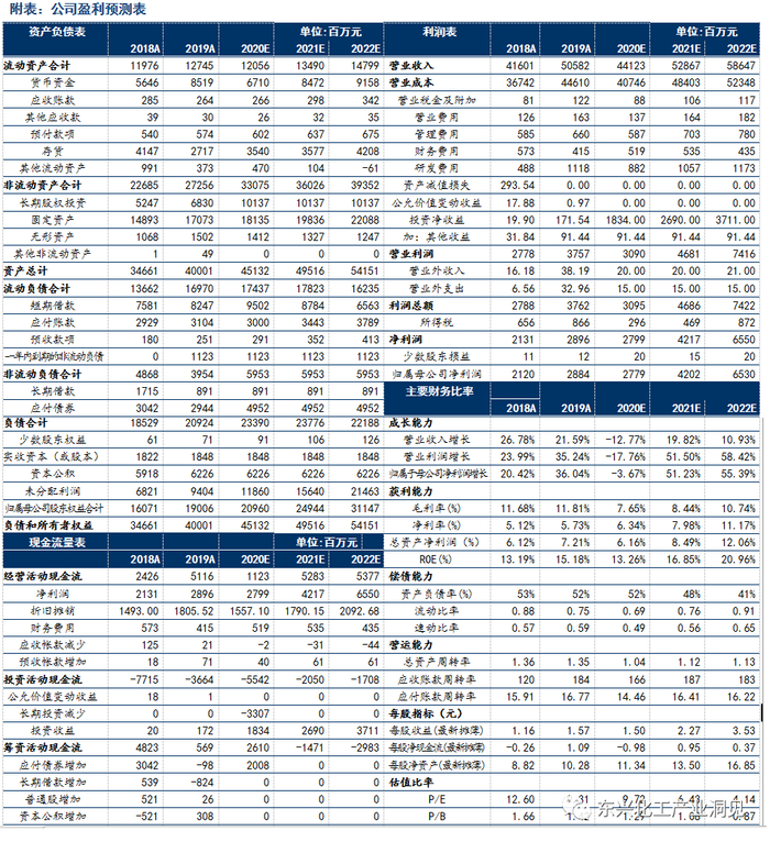 鉴于涤纶长丝行业目前位于景气底部,行业中落后产能难以盈利,我们预计未来两年行业洗牌将会加速。同时龙头公司聚酯产能不断扩张,行业集中度进一步提升。新冠疫情也将在新冠疫苗的推广之下得到控制,前期压抑的消费需求也终将释放。预计2021-2022年行业景气度将不断恢复,公司盈利能力也将恢复到正常水平。同时浙石化二期项目将于今年底试运行,预计明年一季度可以实现满负荷运行。预计2020-2022年浙石化项目将为公司贡献18.29亿元、26.71亿元和36.89亿元的投资收益。而洋口港项目也将于2022年起陆续投产,为公司未来发展提供持续推动力。