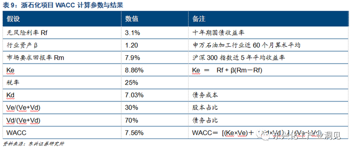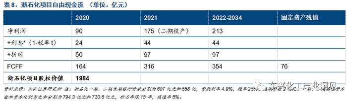 通过自由现金流折现计算可得浙石化20%权益价值为397亿元。浙石化一期、二期税后净利润中枢分别为113亿元和100亿元,由于后续项目不再具有额外的资本开支,在假设公司营运资本不变的情况下公司自由现金流可以用FCFF=净利润+偿还利息*(1-税率t)+折旧摊销来计算。计算公司自由现金流情况如下表所示。