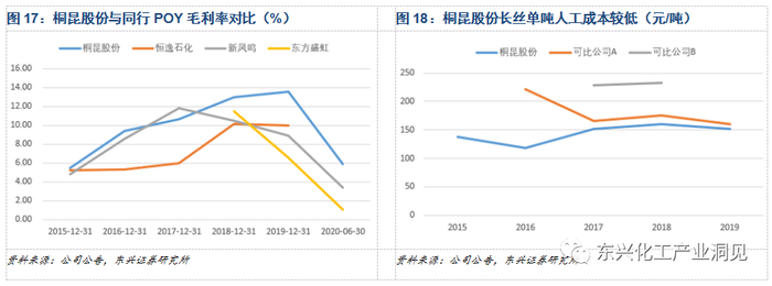 公司涤纶长丝毛利率长期高于同行竞争对手。桐昆股份是国内最大的涤纶预取向丝POY生产企业,在POY长丝生产领域成本优势极为显著。公司的产品策略也是以需求量最大的通用型号产品为主,与国内其他几家聚酯龙头企业采取差异化竞争的策略专注于FDY和DTY的生产不同。2015年来公司的POY长丝产品始终位于行业领先水平,2019年嘉兴石化二期投产之后,公司涤纶长丝上游原料实现配套,毛利率再上一个台阶。涤纶产业属于劳动密集型产业,龙头企业往往拥有过万的员工,而中小企业的员工也动辄上千人,这对人员管理的能力要有很高的要求。仅就人工成本而言,公司单吨涤丝的人工成本在150元/吨左右,在涤纶长丝行业内属于较低水平。