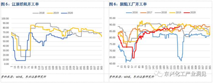 坯布织造开工率回至高位,涤纶产量不降反增加速库存累积。可以看到4-6月份江浙织机的开工率受到疫情影响显著低于过去两年的运行水平。但是七月份以来,江浙织机的开工率也逐渐恢复到六成以上的较高水平,且仍在不断攀升。与之相对应的,聚酯工厂今年在疫情影响之下并未大幅降低负荷,只在春节期间常规降负一个月左右,而去年下半年仍有不少聚酯产能投产。这也使得上半年我国涤纶长丝产量不降反增,达到1724万吨,同比增长2.02%。需求萎缩而供给未减,加速了今年上半年,尤其是一季度涤纶长丝行业库存累积。