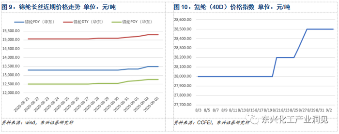“金九银十”传统旺季值得期待,涤纶长丝涨价还需上游提价催化。长期视角来看,我国仍是全球化纤中心,而服装消费回升只是早晚问题。商务部今日也发文表示,随着“金九银十”传统消费旺季到来,中国消费潜力将不断释放,消费增长会在九月份掀起一个新高潮。而四季度国庆档、“双十一”、“双十二”以及国外圣诞节等消费高峰都会促进服装终端消费,锦纶长丝去库存和消费旺季值得期待。