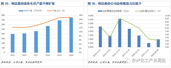 除了在资金实力以及设备技术上的优势,公司在经营管理层面也对中小企业拥有领先优势。首先由于公司的长丝产品种类齐全、规模最大,是众多下游纺织企业和贸易商最为信赖的供货商。多年来公司始终坚持采取现货现款的经营方式,几乎没有多少应收账款,有效减少资金占用的情况。过去几年当中应收账款占营业收入的比例不断下降,2019年仅有0.52%。对于行业下游较为分散的织造企业而言,公司拥有极强的话语权。由于下游客户稳定及公司市占率的不断提升,公司始终保持了较高的开工率,即便是在疫情影响之下的今年二季度,公司实际产销率依然超过100%,继续抢占市场份额。逆境之下,更高的产能利用率体现了公司更高的经营管理水平和行业地位。公司的年报数据显示,除了部分2019年投产的新产能之外,公司其余长丝产能全年开工率基本都超过了100%,部分厂区产能利用率甚至达到140%以上。