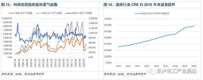 行业洗牌将因新新冠疫情加速。从柯桥纺织行业景气指数来看,每年的9-12月都是全年的景气高点。而在新冠疫情之前,19年11月起涤纶市场的景气指数就已经开始下行,新冠疫情的爆发更是加速了行业景气度探底。三季度至今涤纶长丝POY-PTA不含税价差连续位于千元以下,最低点不到600元。而在上一轮行业景气底部时也出现了类似情况:2015年5月22日至2016年3月7日,涤纶长丝POY-PTA不含税价差始终位于千元以下,平均价差798元/吨。直到2016年2季度原油价格回暖才迎来了行业复苏,然而很多中小企业没能熬到那天。而与2015年不同的是,现如今行业集中度更高,龙头企业对市场的掌控力更强。今年龙头企业在新冠疫情影响之下宁可亏损降价出货,也没有降低聚酯负荷,中小涤丝企业面临着更大的库存压力和生存压力。我们或许很快将会看到涤纶长丝行业的新一轮洗牌。