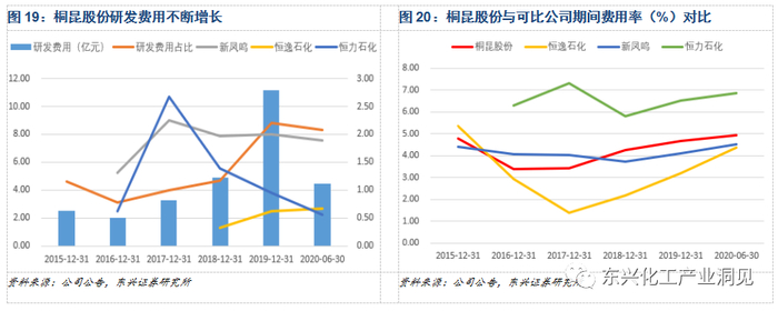 公司重视研发不断巩固产品优势。公司化纤板块现有两家下属企业为国家高新技术企业,同时公司也被认定为国家新合纤产品开发基地,拥有国家认证实验室和国家级企业技术中心、省级企业研究院、院士专家工作站。近几年公司研发支出不断提升,研发费用占比也由2015年的1.16%提高到2019年的2.21%,明显高出同行业竞争对手。2019年,公司联合省内知名化纤企业,共同设立浙江恒创先进功能纤维创新中心有限公司,用于进行先进功能纤维的研发,并提供知识产权运营、技术成果转化、技术服务。2020年公司又成立“浙江桐昆新材料研究院有限公司”这一具有法人主体的研究院,力争在未来发展中更好地做好产学研合作,进一步提升科研创新能力,为公司源源不断提供新的发展动能。公司在产品研发上的投入保证了高端产品的研发和生产,未来有希望继续提升产品的附加值和盈利水平,龙头优势不断强化。