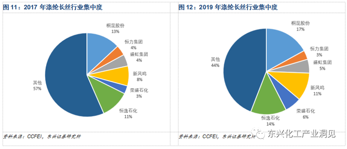 一体化、规模化发展趋势下,聚酯产业的行业集中度进一步提高。国内聚酯涤纶行业经过三十多年的迅猛发展,技术、工艺已趋成熟,近几年进入规模效应体现、上下游产业链配套的发展阶段。随着炼化窗口打开,多家涤丝龙头企业都向上游延伸发展,完善自身产业链供需结构,中小涤丝企业与龙头企业的差距被进一步拉大。在强者恒强的铁律之下,中小涤丝企业想实现对龙头企业的弯道超车已经几无可能。
