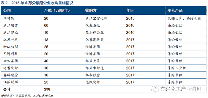 12-16年间惨烈的行业洗牌或将再现。在2010-2012年的行业高景气期间,聚酯行业迎来了产能大幅扩张,并最终于2013年起进入了13-15年的行业大萧条时期。而2014年起的油价暴跌造成的产业链利润空间大幅收窄,更是加速了众多中小企业的破产。而此时的龙头企业依靠资金优势展开对同行企业的并购。2015年以来,涤纶长丝企业间兼并重组多达10次,涉及涤纶长丝产能238万吨/年。2017年3月,恒逸集团分别以6.2亿元和7.2亿元拍下浙江红剑和龙腾科技,两家聚酯装置均于2017年5月重启;7月9日,由恒逸集团控股的逸枫化纤以7.7亿元收购明辉化纤。经过此轮行业洗牌,涤纶长丝行业集中度由2015年起快速提升,CR6由2015年的35%提升至2017年的44%。并最终迎来了2018年聚酯产业链的全面爆发。