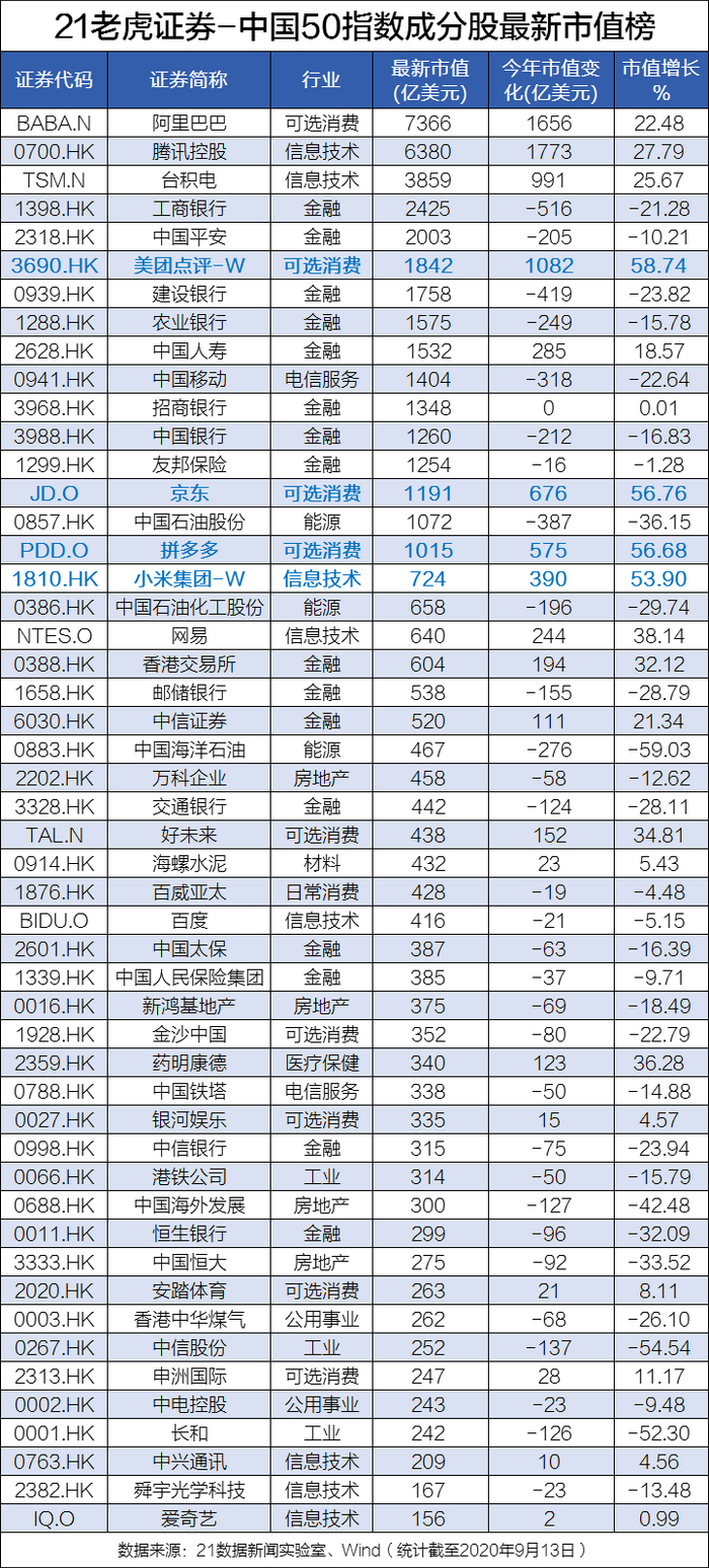 纵观50只指数成分股,今年以来涨跌互半。阿里巴巴、腾讯控股继续保持领头羊优势,市值相比年初均增加约1700亿美元(超过1.1万亿人民币)。