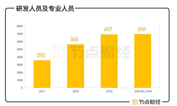 报告期各期末,京东数科研发人员及专业人员数量分别为3953人、5655人、6937人和6969人,呈逐年上升趋势。截至2020年6月30日,在公司9989名在岗员工中,研发人员及专业人员的比例达到70%左右。值得注意的是,京东数科的员工构成也趋向年轻化,80后员工占比达95.5%,而90后员工也达到了近一半。