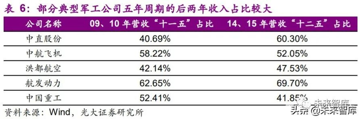 军工行业存在一定的周期特性,从部分主机厂上市公司的营收情况来 看,在“十一五”、“十二五”期间,最后两年的平均营收水平要明显高于 前三年。