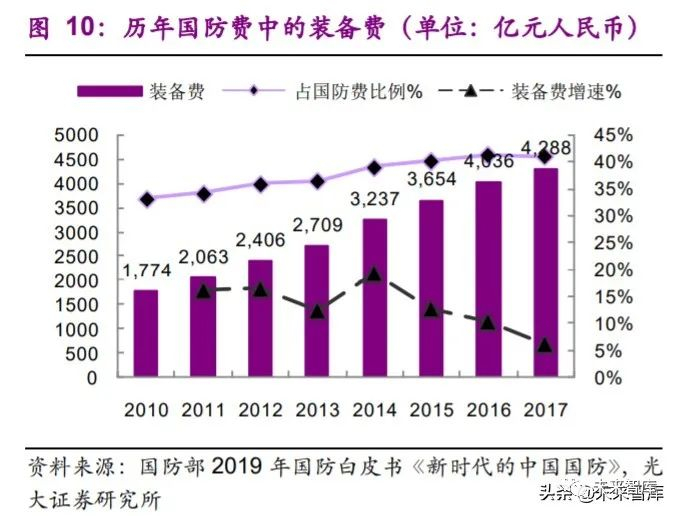 从长期来看,中国国防建设持续推进,国防费呈增长趋势。按照国防白 皮书描述,国防费主要分为装备费、人员生活费、训练维持费三部分,其中 用于武器装备的研究、试验、采购、维修、运输、储存等方面的装备费呈逐 年增长趋势,且在国防费中所占的比例也逐年增长。