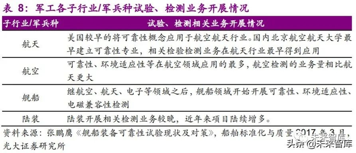 从军工各子行业或军兵种的武器装备开展试验、检测的情况来看,航空、 航天起步较早,舰船随后,陆装在可靠性、环境适应性、电磁兼容性等方面 的试验、检测起步较晚。