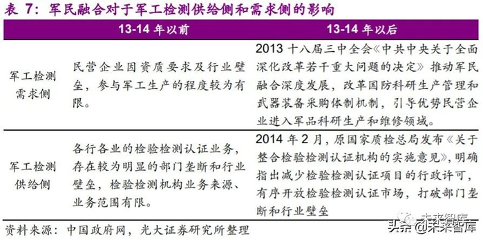 2013 年,国家推动军民融合深度发展;2014 年,国家逐渐放开检验检 测市场,打破部门、行业垄断。二者叠加,使军工检测的需求侧、供给侧都 得到了提升。