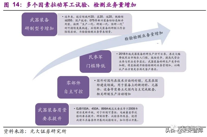 我们认为国防军工行业对于检验检测业务的需求将持续增长,主要受以 下方面因素驱动: