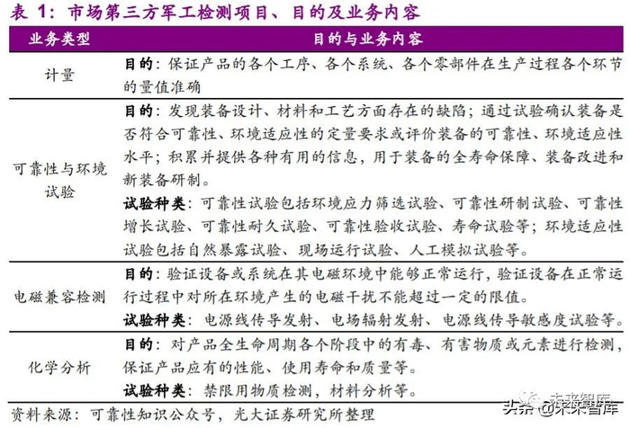 注意以上估算是对武器装备的所有试验、检测环节。市场第三方军工检 测项目如可靠性与环境试验、电磁兼容测试等,仅为其中一部分。我们认为 随着市场检验检测机构实验室建设以及业务能力、服务意识的不断提升,更 多的军工检测项目有望在未来能够向市场第三方检验检测机构放开。