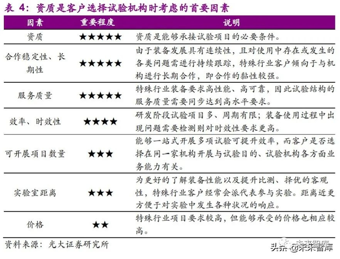 特殊行业客户在选定检测机构时,其资质是首要条件,具有资质才有可 能进入厂商名录或参与投标。此外,服务质量及效率是最为重要的影响考虑 的因素。因此为提升服务质量和效率,多家机构均选择在军工企业较多的城 市如北京、西安、成都等地区建立了实验室。