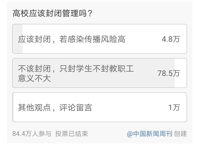中国新闻周刊在微博发起的投票显示,绝大多数网友认为高校不该封闭