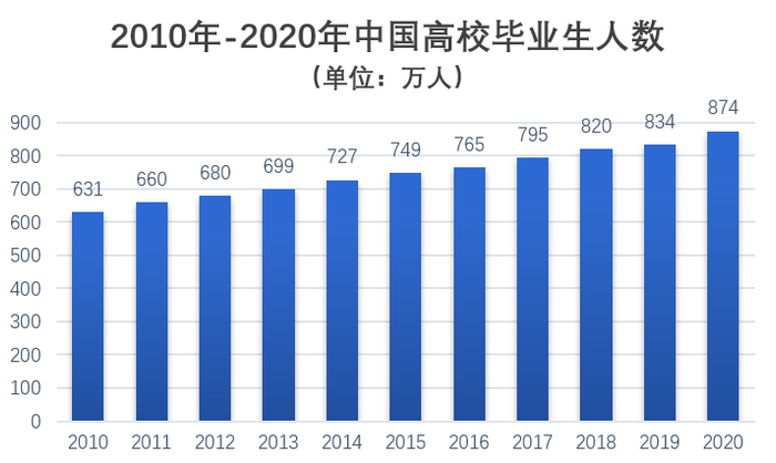 2020届毕业生人数为874万,预计2021届毕业生数量将超900万。然而,2020届仍有相当部分的毕业生处在求职期。
