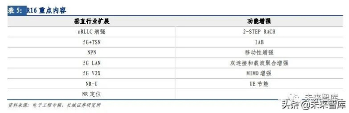 R16 标准冻结,促进 5G 应用加速落地。R16 是 3GPP 制定的全球 5G 标准版本,目前 R16 第三阶段完成,基本代表了该协议版本的完结,7 月 3 日,国际标准组织 3GPP 宣布 R16 标准冻结,意味全球通信行业在 5G 相关技术上达成共识,未来将按照同一个标准生产产 品。R15 在制定过程中,力求以最快的速度产出“能用”的标准,满足了 5G 多方面的基 本功能。而 R16 在 eMBB 的基础上,完善了对 mMTC 和 uRLLC 两类场景的部署,补齐和增 强了 5G 能力三角。大连接支持上,R16 基于现有的 NB-loT 和 eMTC 的空口,扩展 5GC 新 核心网能力,实现对大连接的支持。提升数据传输的可靠性上,R16 提供终端和业务对端 双链路以及基站与核心网网关间双份数据复制和备份两种方案。在保持业务连续性上, R16 通过建立源上行分类器与目的上行分类器之间的 N9 转发通道,实现终端快速移动发 生网关更换时的业务连续性。主要应用场景包括超可靠低延时通信(uRLLC)的增强、对 垂直行业和 LAN 服务的支持、蜂窝物联网的支持与扩展、增强 V2X 支持、5G 定位和定位 服务、UE 无线功能信令优化、5G 卫星接入、5G 网络自动化架构的支持、无线和有线融合 增强、流媒体和广播、用户身份验证,多设备支持、增强网络切片、增强无线 NR 功能等。