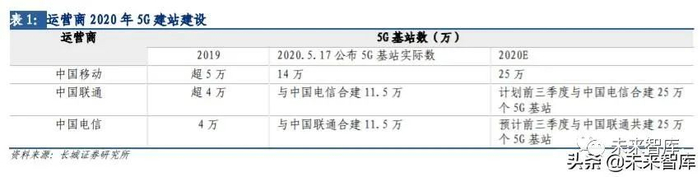 基站建设方面,2020 年全国 5G 基站建设量有望超 70 万站。截至 2019 年底,中国移 动/中国联通/中国电信三大运营商的 5G 基站建成数量分别为超 5 万/4 万/4 万站,合计 约 13 万站。根据运营商在 5.17 世界电信日公布的数据显示,中国移动已建 5G 基站 14 万个。中国联通和中国电信合建基站达到 11.5 万个,覆盖全国所有地级市城区。从中国 移动此前公布的 5G 二期无线网主设备集中采购公告来看,共有 28 个省、自治区、直辖 市发布集采,需求数量总计 232143 个基站,这将有力保证中国移动今年建设超 25 万个 5G 基站的目标,确保 2020 年内在全国所有地级以上城市提供 5G 商用服务。在 5G 建设中 采取共享战略的中国联通和电信,也已启动设备联合集中采购,预计规模不少于 25万站, 并计划在前三季度完成全部建设进度。由此我们预计 2020 年总体基站的建设量将在 70-80 万站之间,较 2019 年基站数增长 438.46%-515.38%。