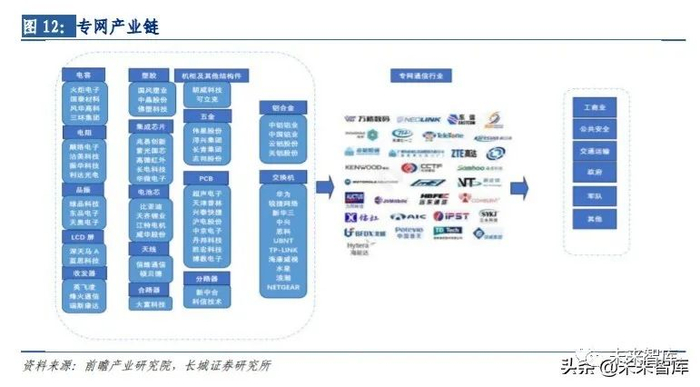 5G 公网+专网齐头并进,助力 5G 网络下沉企业,加速 5G 与行业融合。5G 专网建设上, 政策、技术、及产业链全方位助力 5G 与专网的融合从而加速 5G 行业应用。政策方面, 2020 年 3 月 24 日工信部发布《关于推动 5G 加快发展的通知》,要求组织开展 5G 行业虚 拟专网研究和试点,实现标准、技术、应用、部署等关键环节衔接畅通;技术应用方面, 中国信息通信研究院组建的 5G 产业应用方阵成立了“5G 行业虚拟专网研究项目组”,旨 在全面推进 5G 行业专网相关的技术研发、标准制定、测试验证和实际部署等;运营商方 面,三大运营商也积极跟进行业客户需求,如和行业客户共同探索行业解决方案、在具 体应用场景如港口工厂等开展试点,中国移动在 5G 专网上推出优享专网复用公网、专享 专网按需增补基站、尊享专网蚕蛹基站深度定制等不同专网类型满足不同企业需求,从 而加速 5G 与行业融合。专网企业方面,海能达等专网企业 2020 年以来积极与运营商、 政府行业等客户在相关领域展开交流与合作。从政府到科研单位,再到运营商及专网企 业,全产业链协同合作推进专网在 5G 时代的快速部署。5G 公网专用上,中国移动研究院 院长张同须于 2019 中国无线电大会上表示,通过运营商的公网,并通过网络切片等方式 提供给特定行业使用,相较于行业自行建设专网可提升我国频谱利用率、降低成本、提 升速率、并可提高网络可靠性,故而 5G 公网叠加新技术可为行业提供除专网外的另一种 更为经济的选择,进一步加速 5G 与行业融合。