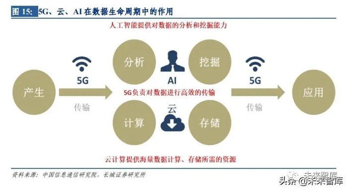 “5G+云+AI”等技术融合创造更大价值,技术融合加速 5G 向行业渗透。人工智能(AI)、 5G、云计算等为代表的新技术正朝着深度融合的方向发展,5G 的可靠网络连接、云计算 的海量算力、AI 的颠覆性潜能正在相互协同,融合发展模式将进一步加强现实世界与数 字世界的互动互促,深入到各行各业之中,创造出诸如“智能制造”、“智能网联车”、“智 慧城市”等潜力巨大的数字经济产业,新的业务体验、新的行业应用以及新的产业布局 正在徐徐展开,成为我国数字经济发展的重要引擎。例如中国电信天翼云与成都道桥监 管中心于 2019 年 7 月展开合作,发布了国内首个“5G+云+AI”智慧监控商用项目,通过 5G 网络的高带宽来将 4K 视频传输到后台的天翼云 GPU 服务器,再通过 AI 对它进行分析, 目前已实现道路桥梁表观病害的识别维护和对桥梁整个架构的监测方面的智能改进,大 大提高了对于病害识别的准确性和日常维护的效率。二期工程将支持路桥的积水管控, 在暴雨季节传感器会第一时间通过 5G 信号将信息传回服务中心,云计算能力会结合影像 和 AI 计算积水的面积和深度,为救灾抢险和市民出行提供保障。从微观层面上看,“5G+ 云+AI”技术是企业构建数字业务体验平台、政府服务模式创新的重要保障;从宏观层面 上看,“5G+云+AI”将加速农业、工业、服务业三大产业供应链的智能化,将数字产品和 服务的理念从最初的生产者传递到最终的用户。未来 AI、大数据分析、云计算等平台的 建立或需依托于 5G 传输,新一代信息技术的融合效应带动 5G 向各行业渗透。