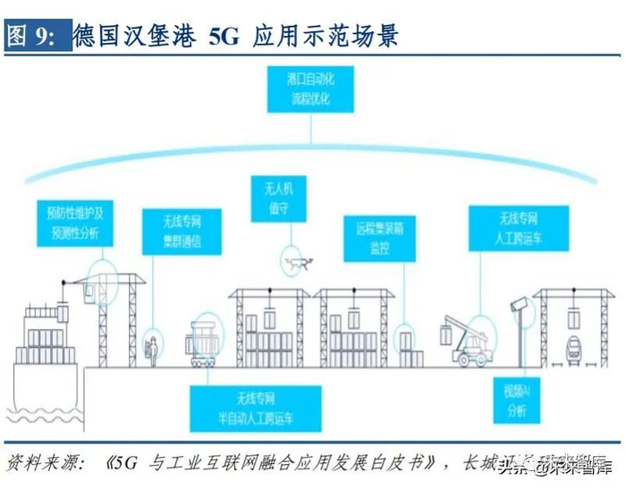 5G 与传统行业结合,提升行业生产效率。5G 通过有针对性的定制化、与医疗、娱乐、交 通等传统旧有产业等深度融合,有效满足行业的多样化业务需求,实现各行业全面数字 化、网络化和智能化的全新转型,助力提质增效降本。据华为副董事长徐直军在演讲中 表示,5G+云+大数据+AI 等技术结合将提升上产效率十倍以上。例如 5G 通过自身独具 的大带宽和低时延能力,成功实现了港口龙门吊远程操控。龙门吊在传统作业方式下需 要现场操作,单人只能同时操控一台龙门吊;但在 5G 远程操控下,每个工人可以同时操 控 4 台龙门吊,节省 70% 人力成本,也使得每小时货物处理量从 25 箱提升到 30 箱,还 同时降低了安全生产风险,使得操作人员工作环境大幅提升。