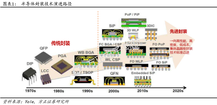 先进封装应运而生。上世纪90年代之后,随着半导体技术的发展,越来越多前道工艺的步骤被引入后道工艺当中,两者间界限越来越模糊。随之而来的是,越来越多超越传统封装理念的先进封装技术被提出,向着高性能、高密度、低成本、集体晶圆级封装技术标准迈进。