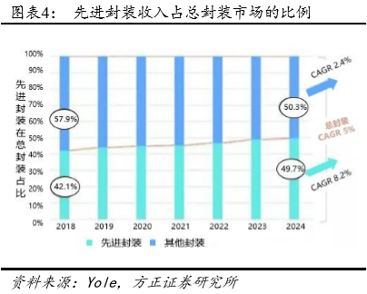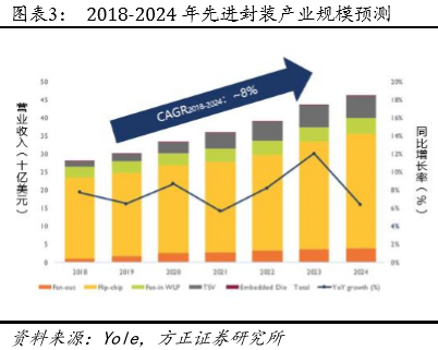 增量市场持续打开。目前半导体产业正处于转折点,业界亟需IC封装来维持摩尔定律的进展,先进封装以其独特的优势进入最成功的时期。Yole研究预测指出,先进封装将保持成长趋势,2018-2024年间以8%的年复合增长率成长,到2024年达到近440亿美元。相反,在同一时期,传统封装市场仅以2.4%的年复合成长率成长,而整个IC封装产业CAGR约为5%。